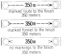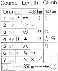 The example shown here begins with a course designation (in North America, Orange refers to the intermediate level course). The second entry in the heading is the length of the course (in kilometers or meters), which is always measured as the minimum distance an orienteer would have to travel to complete the course (in other words, along the straight line except where an obstacle such as a lake or out-of-bounds area forces a deviation from the line. The third entry in the heading is the climb, in meters, as measured along the "ideal" route (as determined and measured by the course setter). Each succeeding line in the clue list describes the location of a control, and the final line describes the approach to the finish from the final control.