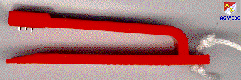 is a bright red plastic device with a number of sharp metal teeth. The orienteer