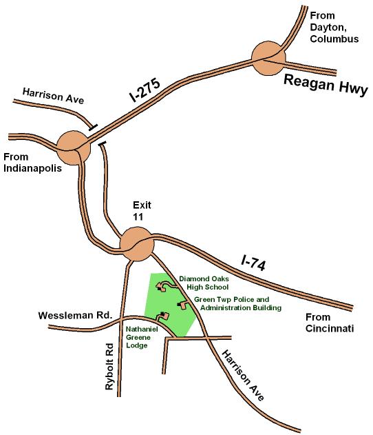 Once on Harrison Ave, follow event specific directions to Green Twp Police and Administration building, Diamond Oaks School, or Nathaniel Greene Lodge.