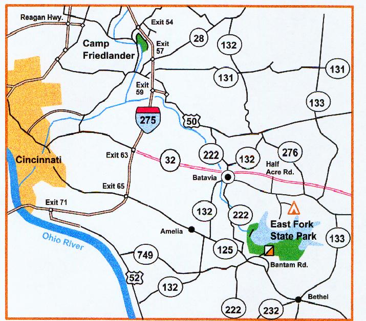 This map shows our location on the south side of East Fork State Park. We also have events on the north side. Please be sure to read the directions on the event schedule page and link back to the location map from the schedule page. If the event is on the north side, you will see a different map.